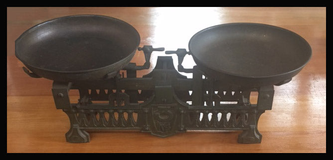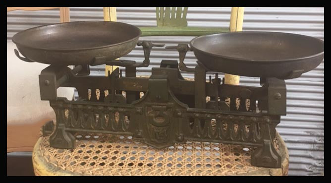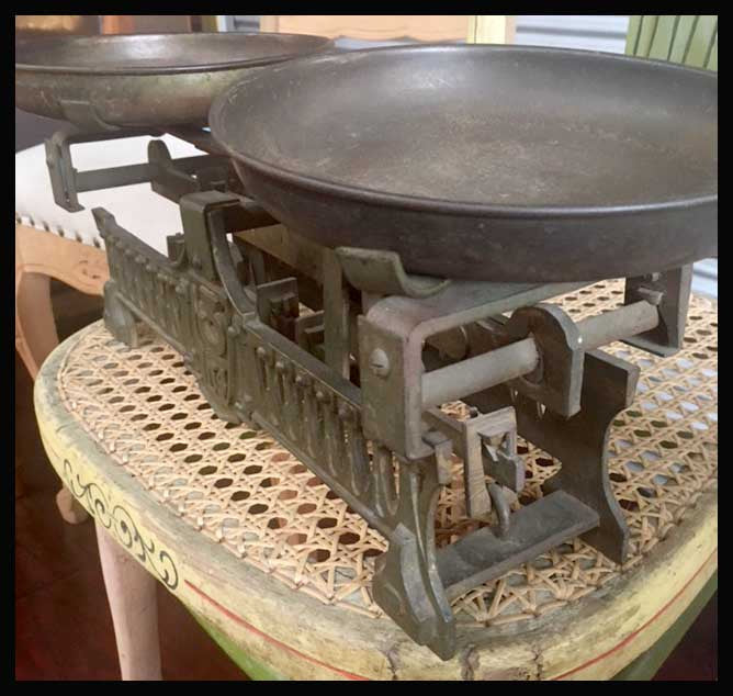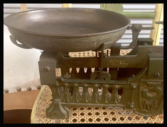 Pesa de fierro fundido con todos sus pesos que funciona hasta 3 kilos. Antiguamente se utilizaban para pesar alimentos y otros productos en almacenes y confiterías. Actualmente se les suele dar un uso decorativo, aunque esta pesa es también funcional.