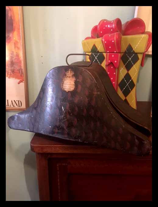Viene con su sello de fábrica y su caja de lata original, que tiene la misma forma del sombrero.