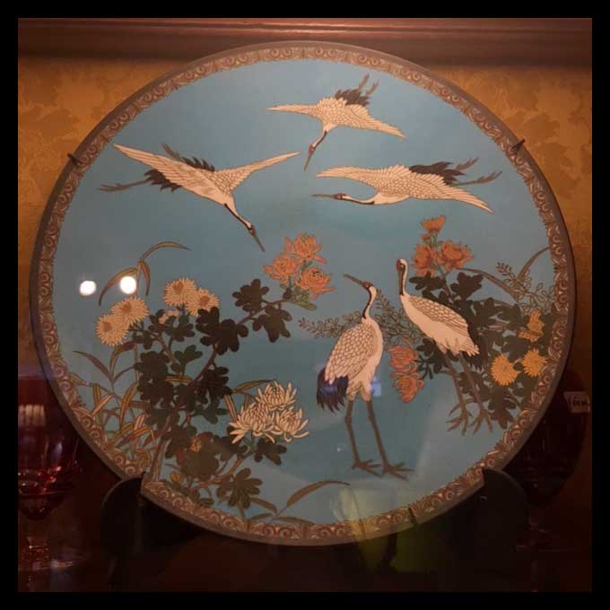 Par de preciosos platos japoneses. Están pintados en tonos grises y café, con una escena de garzas volando y posadas sobre plantas y flores.