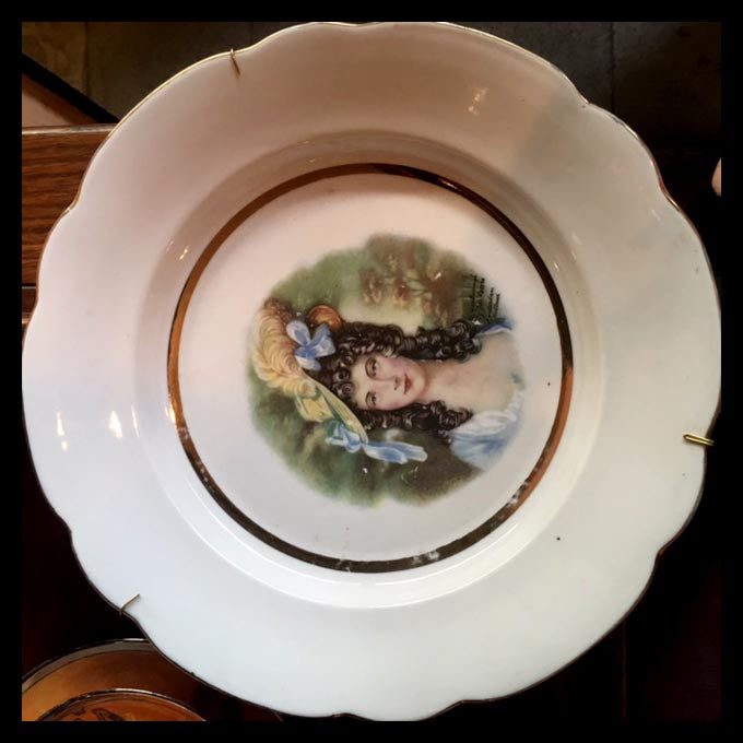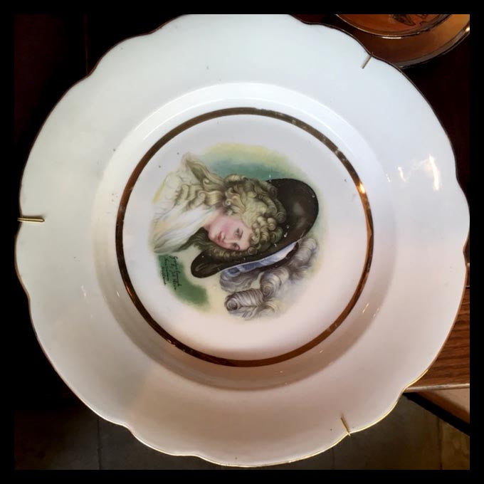 Par de platos decorativos. Son de porcelana blanca y tienen pintado al centro la figura de una mujer. La mujer de cada plato es distinta, pero comparten el uso de grandes y llamativos sombreros.