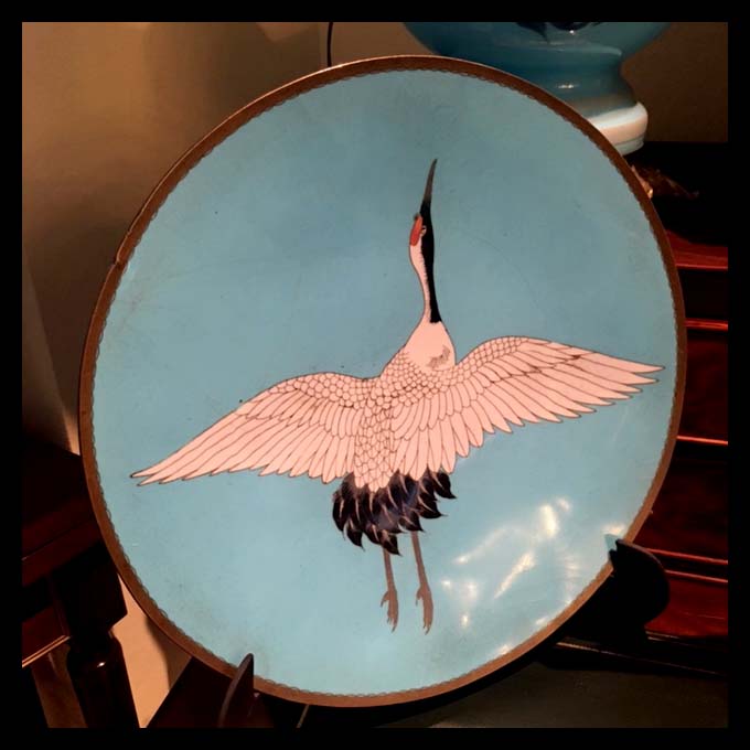 Plato cloissoné celeste con borde dorado y un ave en tonos blanco y negro pintada al centro.