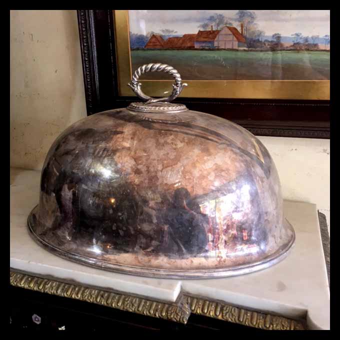 El plaqué es una chapa de metal precioso que se une a otros metales de menor valor, obteniendo la misma elegancia y brillo. Usualmente se trabaja en plata.Esta es una tapa de plaqué que se usa tradicionalmente para cubrir un pavo asado sobre una bandeja.Mide 50 // 39 // 28 cm.