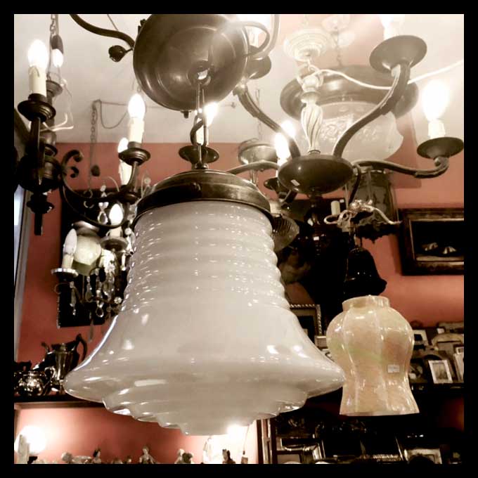 La invención de la luz eléctrica permitió diversificar en gran medida el diseño de nuevas formas de iluminación.Lámpara de cielo art decó. Tiene cadena regulable para elegir la altura a la que se quiere colgar y la pantalla es de opalina blanca.
