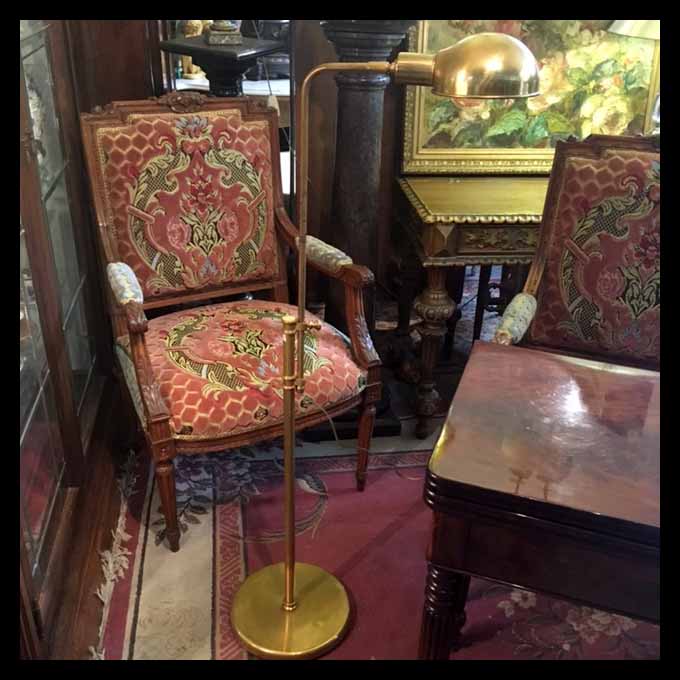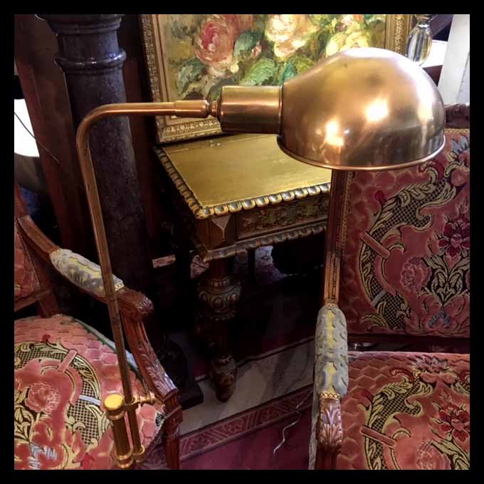 La invención de la luz eléctrica permitió diversificar en gran medida el diseño de nuevas formas de iluminación.Lámpara de pie hecha completamente de bronce. Tanto la altura como la posición de la pantalla son regulables.