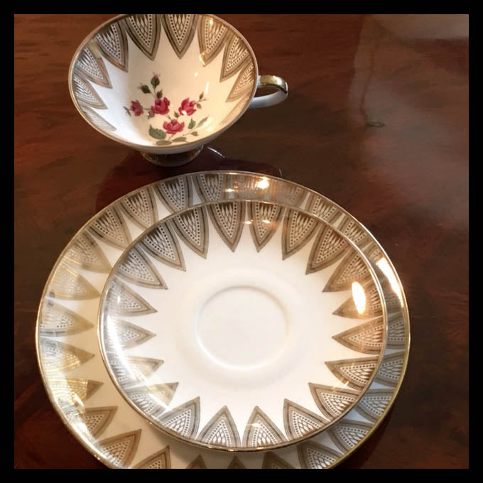 Esta es una taza con su platillo y un plato de pan de porcelana Bavaria. Son blancos con dibujos geométricos en dorado. La taza tiene además en su interior un diseño con motivos florales.