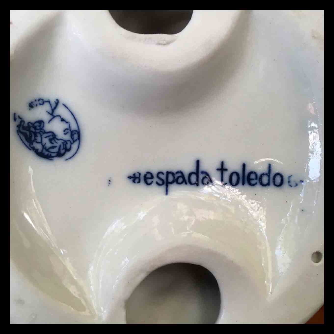 Par de figuras de porcelana española en tonos nude. Son unas mujer y un hombre con vestimentas en los mismos coloridos y con un pájaro en la mano. Tienen sello “ESPADA TOLEDO”.