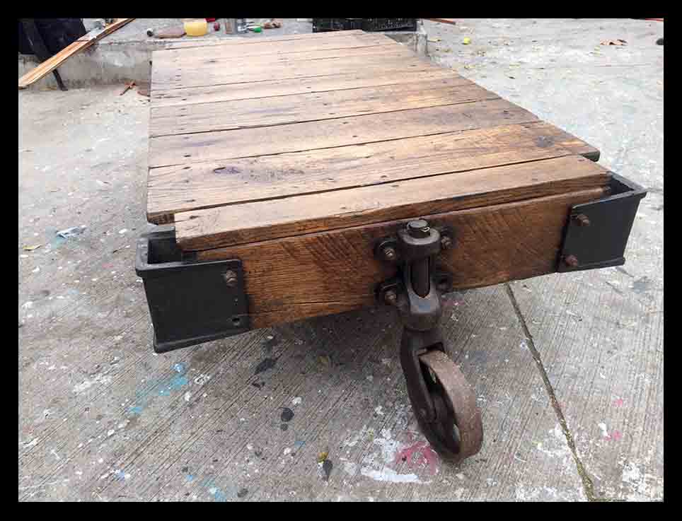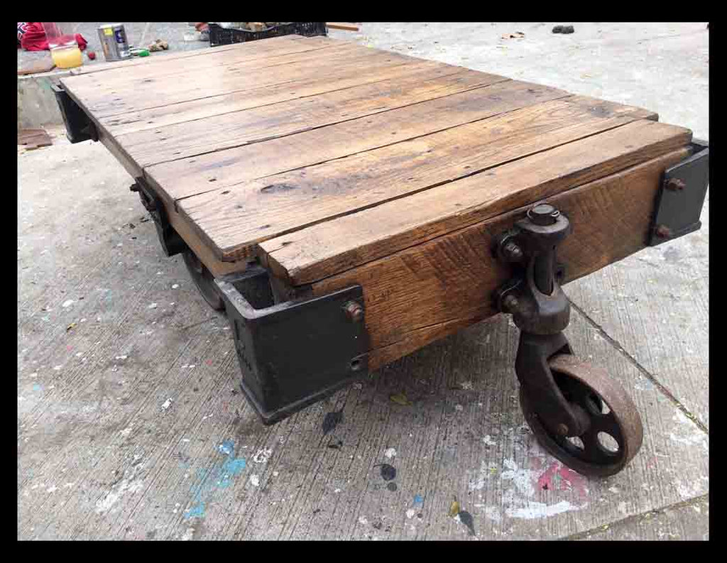 Antiguo carro de carga de madera y fierro con rueditas. Si bien se puede utilizar para su uso normal, que es transportar objetos sobre él, es común utilizarlos como mesas de centro.