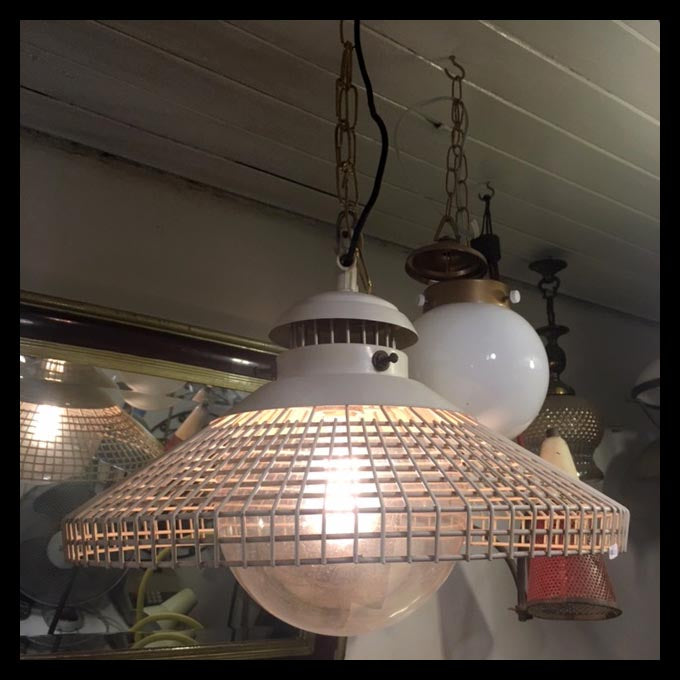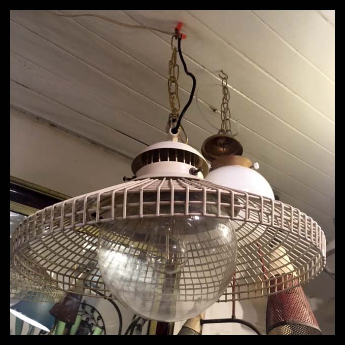 La invención de la luz eléctrica permitió diversificar en gran medida el diseño de nuevas formas de iluminación.Lámpara industrial de cielo. Es metálica y pintada de color blanco y tiene una gran ampolleta que queda visible.