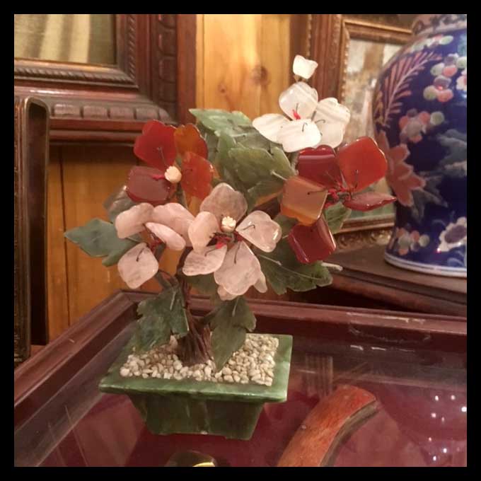 Decorar espacios con motivos florales y propios de la naturaleza es algo que se ha usado desde hace siglos. No sólo se han replicado flores y árboles en porcelana, metales, vidrios y piedras, sino también se han estampado y dibujado estos motivos en telas y loza y se han tallado en madera.Pequeño arbolito de piedra dura con base de jade. Tiene flores en tonos rojos y rosados.