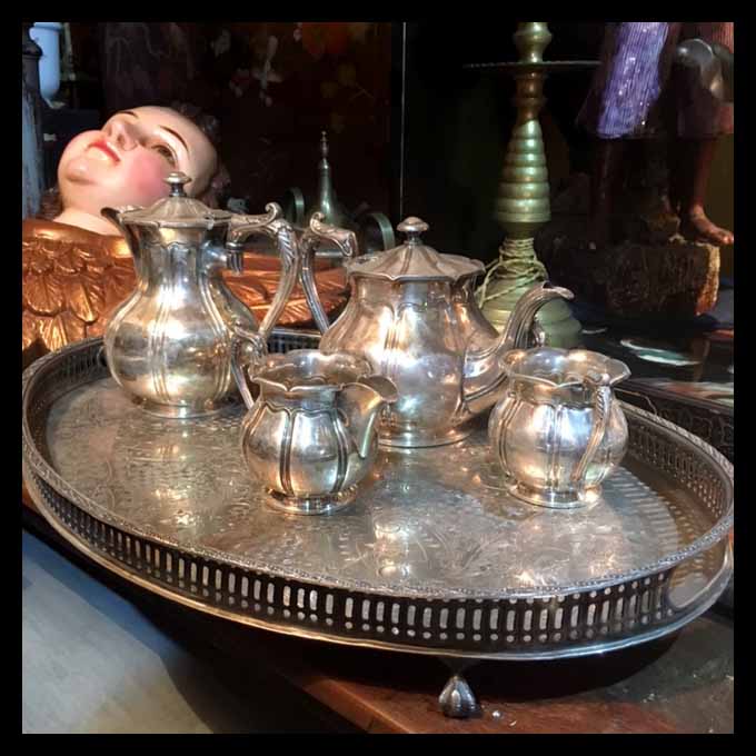 Este es un juego de té de cuatro piezas de plaqué. Incluye dos teteras, lechero y azucarero y viene con su bandeja ovalada con patitas.