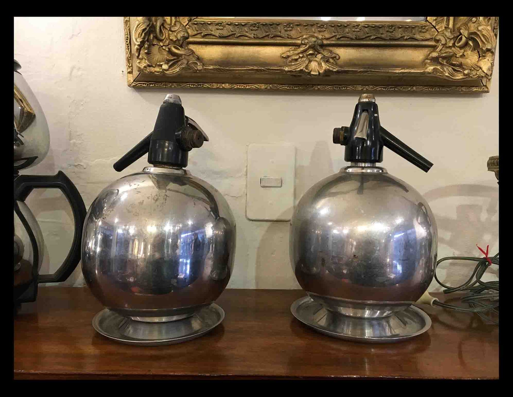 Los sifones de soda son recipientes herméticos que se usaban originalmente para contener agua gaseosa o carbonatada. Estas botellas funcionaban a presión y poseen una válvula para su apertura. La industrialización del agua mineral, ha disminuido el uso de este artefacto, por botellas plásticas. Lo más común es encontrar antiguos sifones hechos de vidrio de colores, sin embargo estos son un par de sifones esféricos hechos de metal.