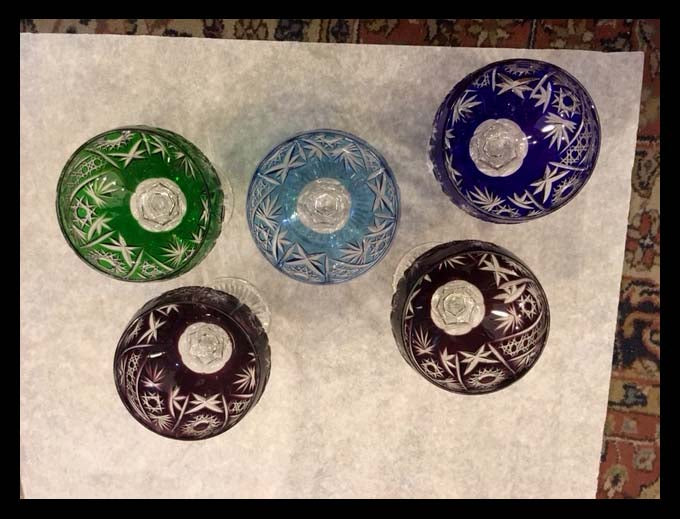 Se vuelven populares en Inglaterra a comienzos del siglo XVIII. Luego en Alemania y Bohemia (actual Checoslovaquia) se desarrollaron piezas de mayor complejidad combinando distintos tipos y profundidades en los cortes.Juego de cinco copas de cristal cortado de Bohemia. Hay dos moradas, una azul, otra celeste y una verde.