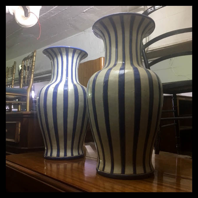 Par de jarrones blancos con rayas azules. Miden 60 cm de alto.