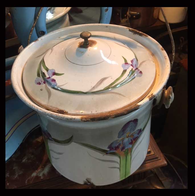 El enlozado surge en los países industrializados con el propósito de mantener la comida caliente. Se hizo muy popular en el período entreguerras. Hoy se han vuelto a poner de moda como elementos funcionales y también meramente decorativos. Los saltados y marcas provocados por el calor y el uso, pueden ayudarnos a determinar la antigüedad de las piezas. Esta es una olla enlozada blanca con motivos florales, viene con su tapa.