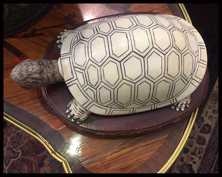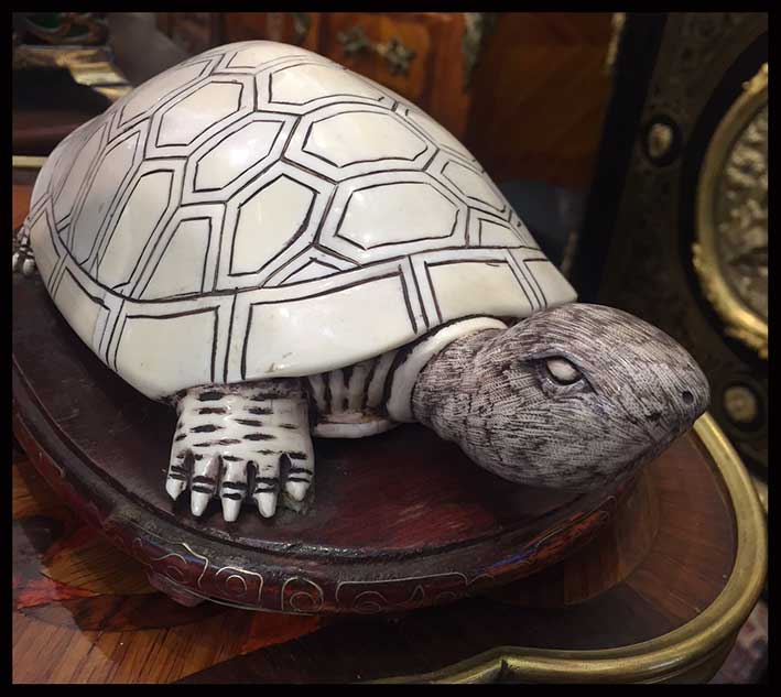 Tortuga decorativa de cerámica pintada a mano en colores blancos y negros. Está sobre un pedestal de madera, para apoyar sobre alguna mesa.
