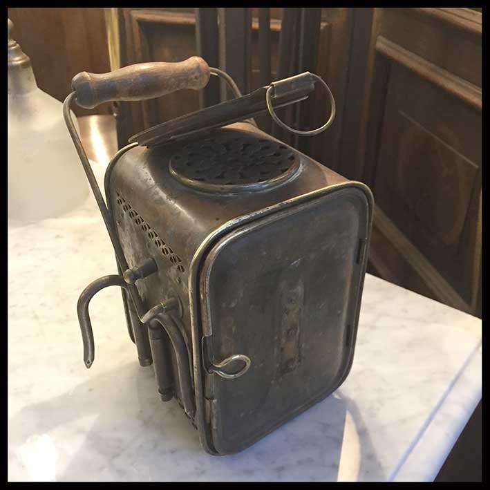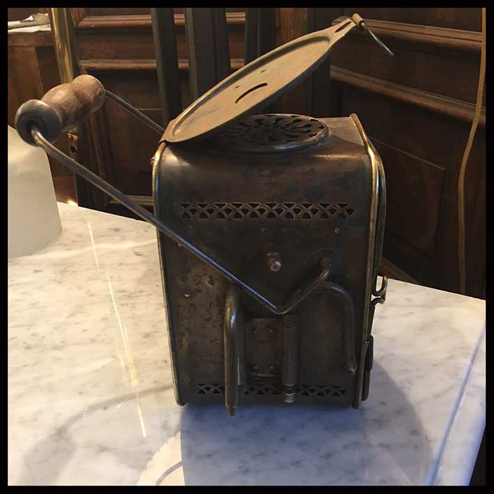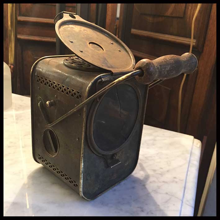 Antiguo mechero de tren con mango para ser transportado.