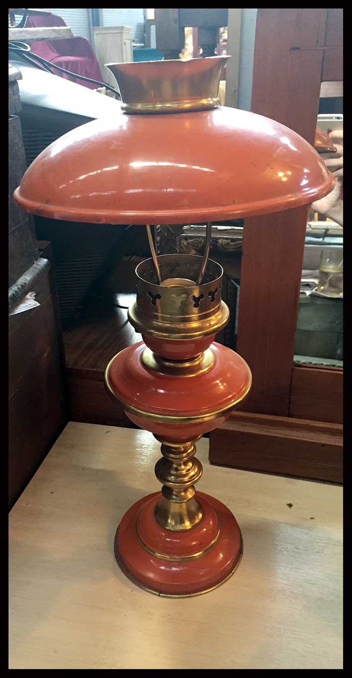 Lámpara de escritorio metálica de color naranja. Tiene su original estanque de parafina.