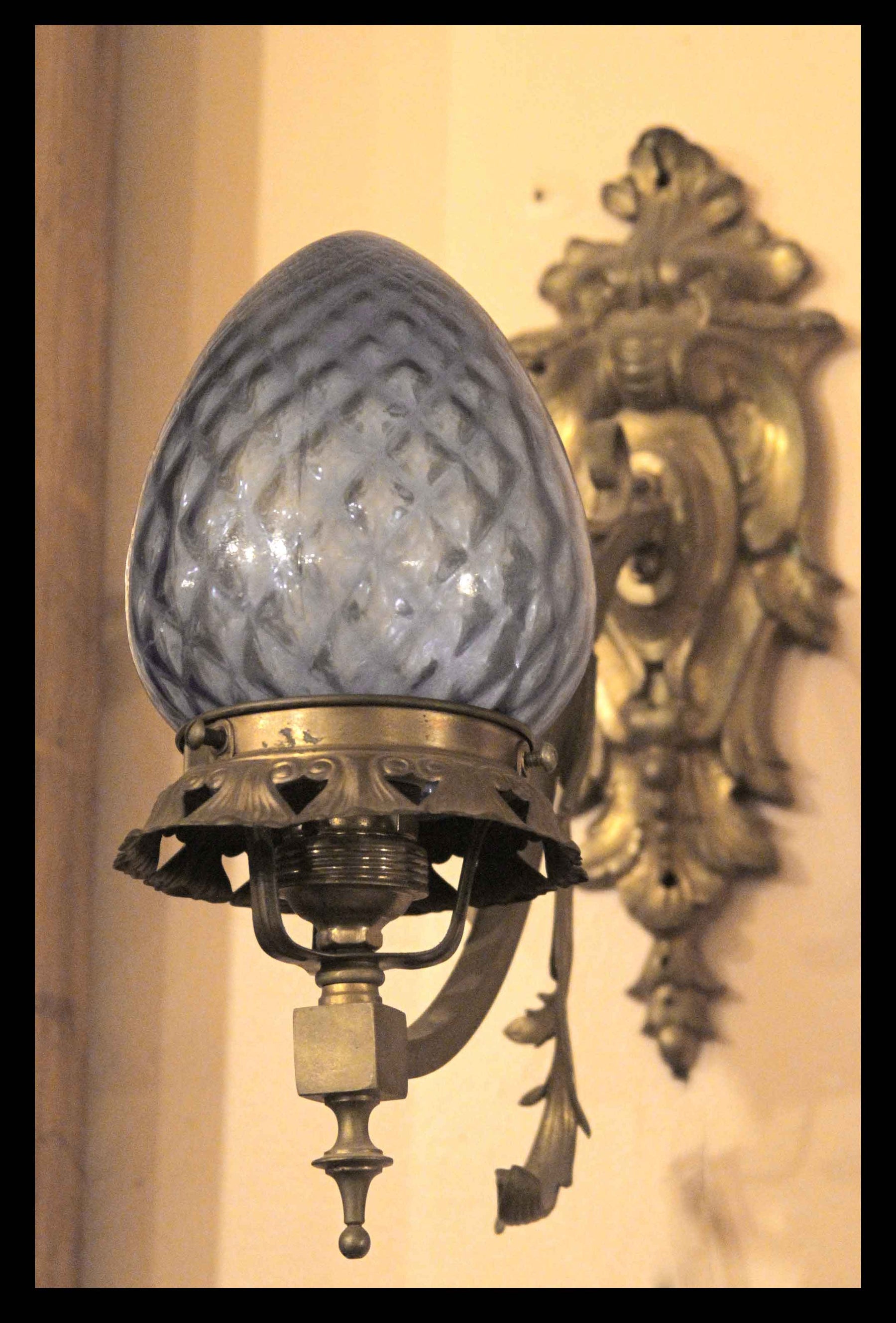Dos apliqués de muro de bronce y vidrio azul.TII.156 APLIQUÉSEVendidos$Vendidos