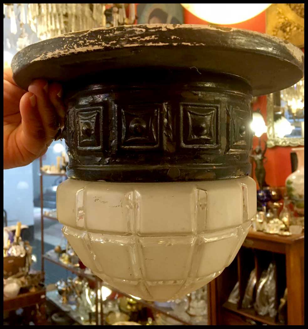 Esta es una lámpara de cielo con pantalla de vidrio empavonado estilo art decó, tiene diseños geométricos en la base y la pantalla.