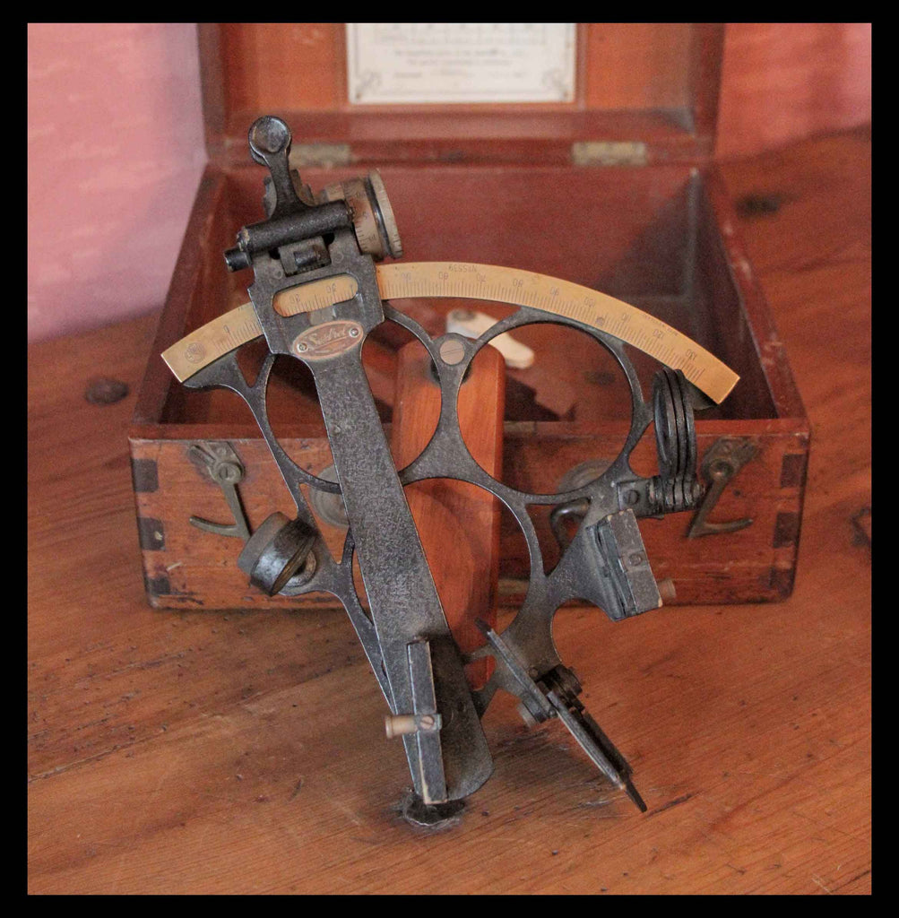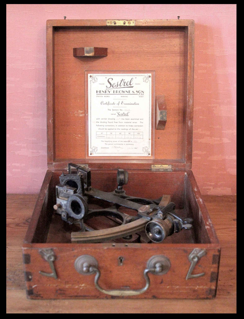 Los sextantes son instrumentos astronómicos para medir posiciones de astros, en general del sol. Conociendo la elevación del sol y la hora del día, se puede saber la latitud en que se encuentra el observador. Fueron de mucha utilidad en navegación marítima y aérea, pero luego fueron reemplazados por el astrolabio. Hoy los sextantes antiguos, sobretodo aquellos que se encuentran con sus sellos y cajas originales, son de gran interés de coleccionistas. Este en particular es de Sestrel de mediados del siglo XIX y se encuentra en su caja y con sus papeles originales.