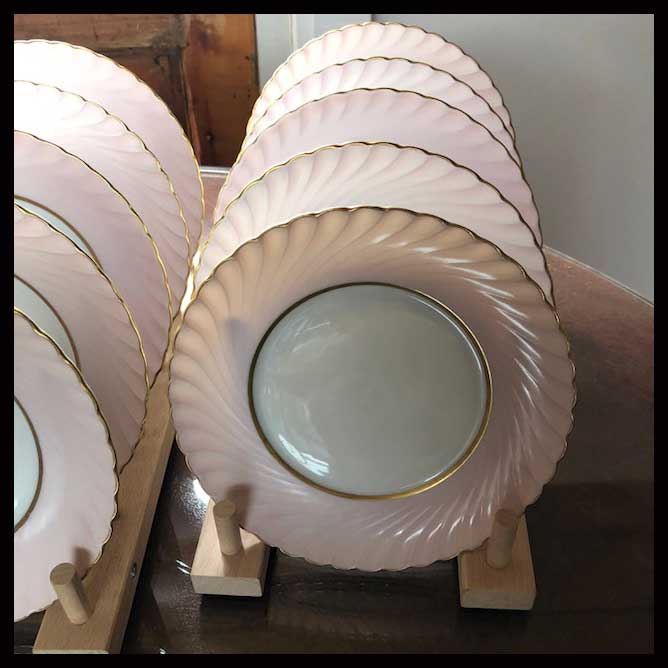 Con origen en un término italiano, la porcelana es una especie de loza fina que fue inventada en China entre los siglos VII y VIII. Se trata de un producto cerámico que suele ser blanco, translúcido, compacto y duro.Juego de doce platos de fondo de porcelana blancos con borde rosado. Tienen terminaciones en dorado.