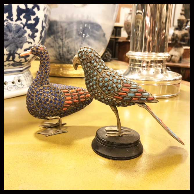 El cloissoné es una antigua técnica decorativa consistente en aplicar esmalte vidriado sobre materiales metálicos. El trabajo consiste en que sobre una base de metal, se hace un fino dibujo con un alambre de cobre fundido y se van poniendo los polvos esmaltados para luego hornearlos. El orden en que se pone cada color es fundamental y se comienza por aquellos que resisten más calor.Par de pajaritos de cloisonné con incrustaciones.