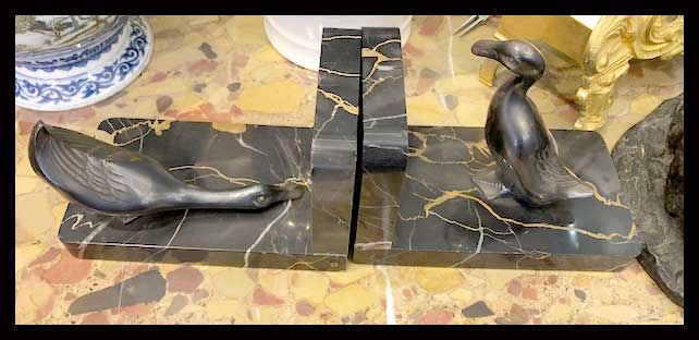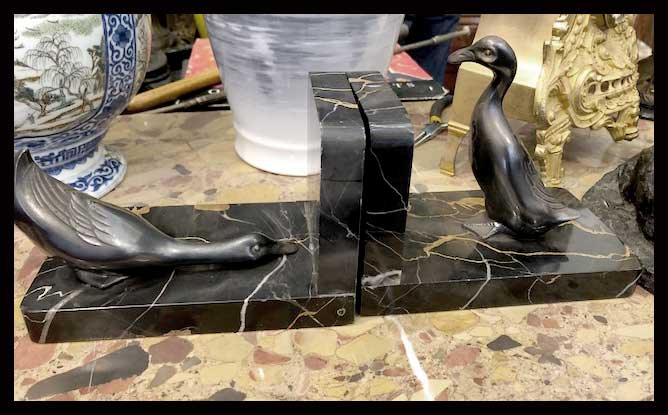 Par de apoya libros de pájaros en distintas posiciones. Ambos vienen sobre una base de mármol negro.