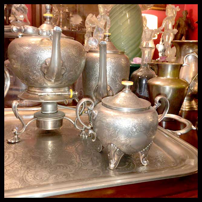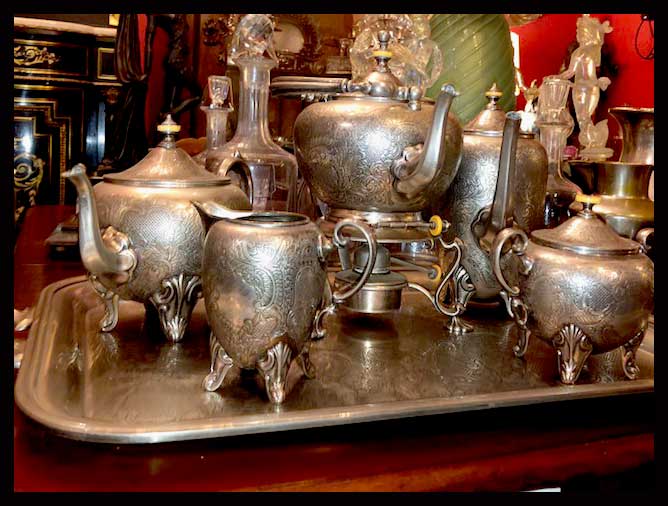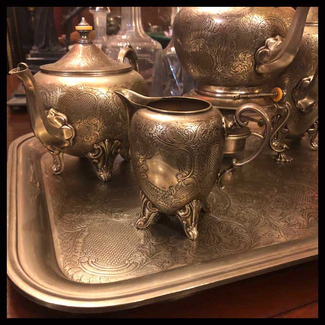 El té se introdujo desde China a Inglaterra a mediados del siglo XVII. Con esto, comenzó a desarrollarse toda una moda en torno a la forma de consumirlo. Era un producto extremadamente caro que se guardaba en cajas con llave. Recién a fines del siglo XVIII se hicieron populares los servicios completos de té.Este es un completo juego de té con su bandeja original, todo de plaqué.