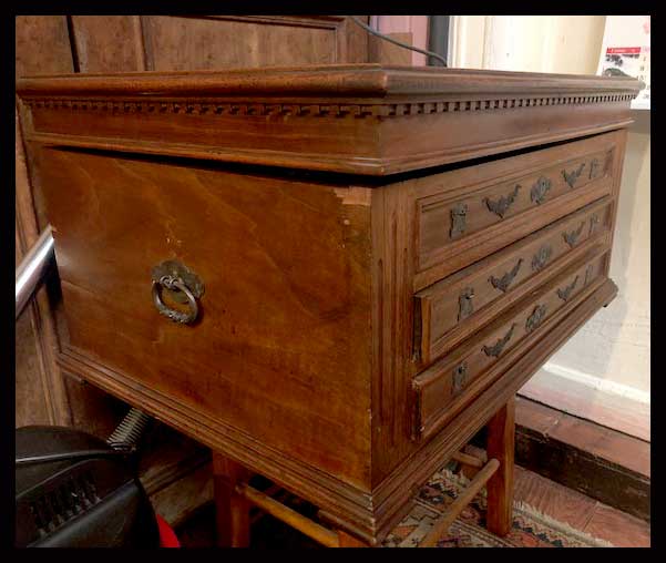 Cuchillería completa, toda hecha de plata maciza de origen portugués. Es para doce personas e incluye cubiertos de servir, cubiertos de carne, pescado y postre. Viene en su caja original de madera, dispuesta como bandejas en distintos pisos que organizan los cubiertos.