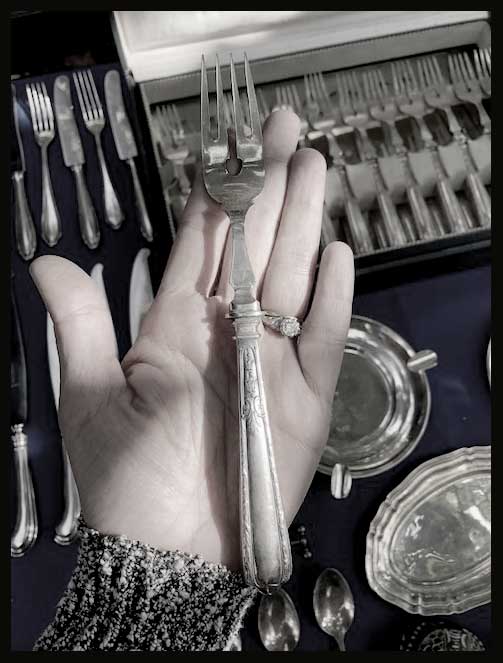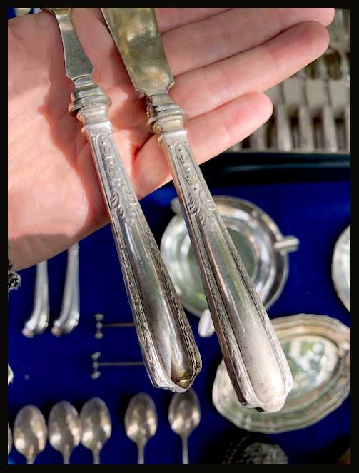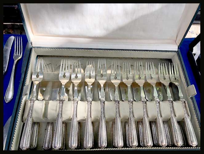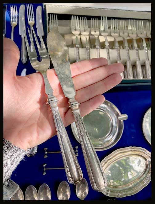Juego de cuchillería de pescado de plaqué completo para doce personas. Tiene un delicado dibujo en el mango de los cubiertos.