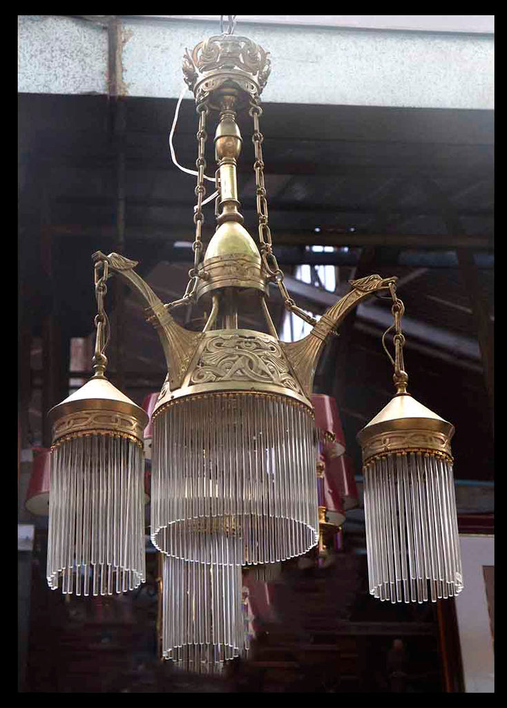 Lámpara de bronce tipo candelabro colgante. Su estructura central, de cadenas y figuras de animal, sostiene la base central y sus tres brazos, de los cuáles se desprenden cristales tubulares que crean cortinas en torno a los puntos de luz haciendo que la luz salga de manera refractada y se disperse, aportando calidez al espacio.