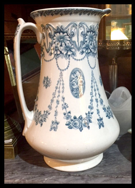 Jarra de loza pintada en motivos florales azules. Normalmente estas jarras se usaban tipo vanitorios acompañados con una vasija de igual diseño. Por algún motivo, con el paso de los años, estas piezas se separaron y hoy sólo está disponible la jarra y puede usarse para distintos propósitos.