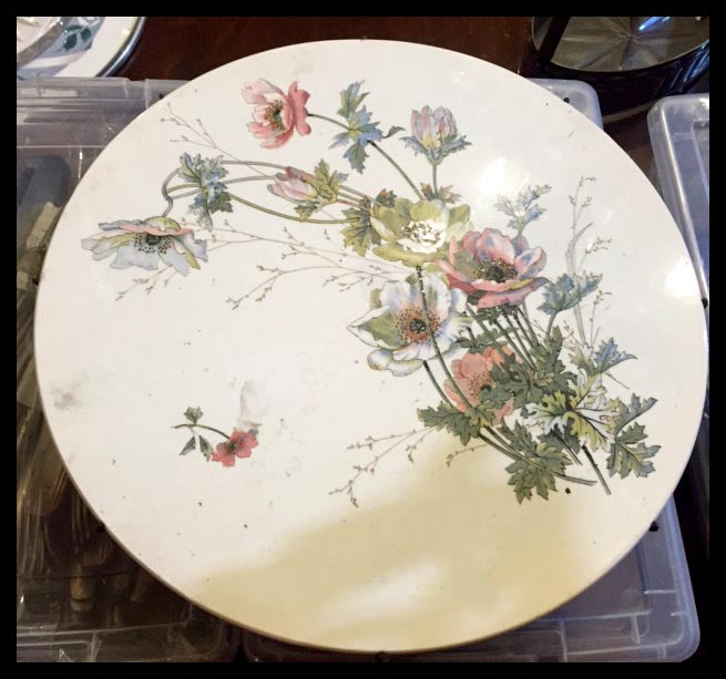 Bandeja de cerámica pintada a mano con motivos florales. Posee una base centro que la despega de la mesa y le da altura.