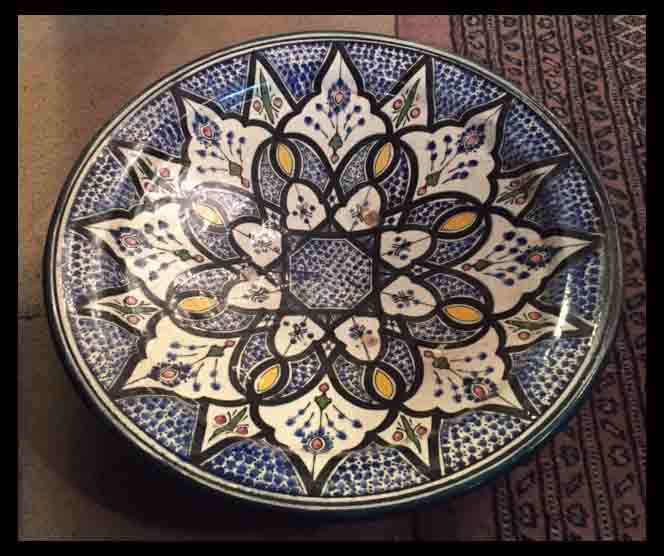La cerámica es una de las razones que hace popular a Marruecos. Este frutero o centro de mesa de diseño marroquí es un clásico en tonos azul y blanco que probablemente proviene de Fes.La tradición islámica prohíbe los dibujos de humanos y animales, por lo que sus diseños son principalmente geométricos, caligráficos y ornamentales. Marruecos posee distintos tipos de tierra que no están en otros lugares del planeta, lo que hace que su cerámica sea única.