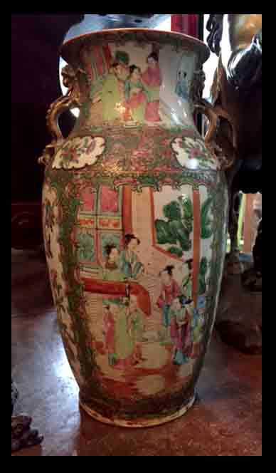 Las porcelanas fabricadas en China para la exportación desde fines del sXVIII hasta comienzos del sXX eran denominadas Porcelana de Cantón. Su nombre se debe al puerto en el cual embarcaban a Europa y América, pues fueron creadas en Jingdezhen.Este jarrón cantonés es de la denominada “Famille Rose” que, como lo sugiere su nombre, usaba el color rosa en todos sus tonos desde el más pálido al más fuerte combinado en general con el verde. Abundan paisajes, motivos florales, pájaros, insectos y animales en sus motivos. Posee asa de bronce.Tiene una pequeña trizadura interna que ha sido reparada.