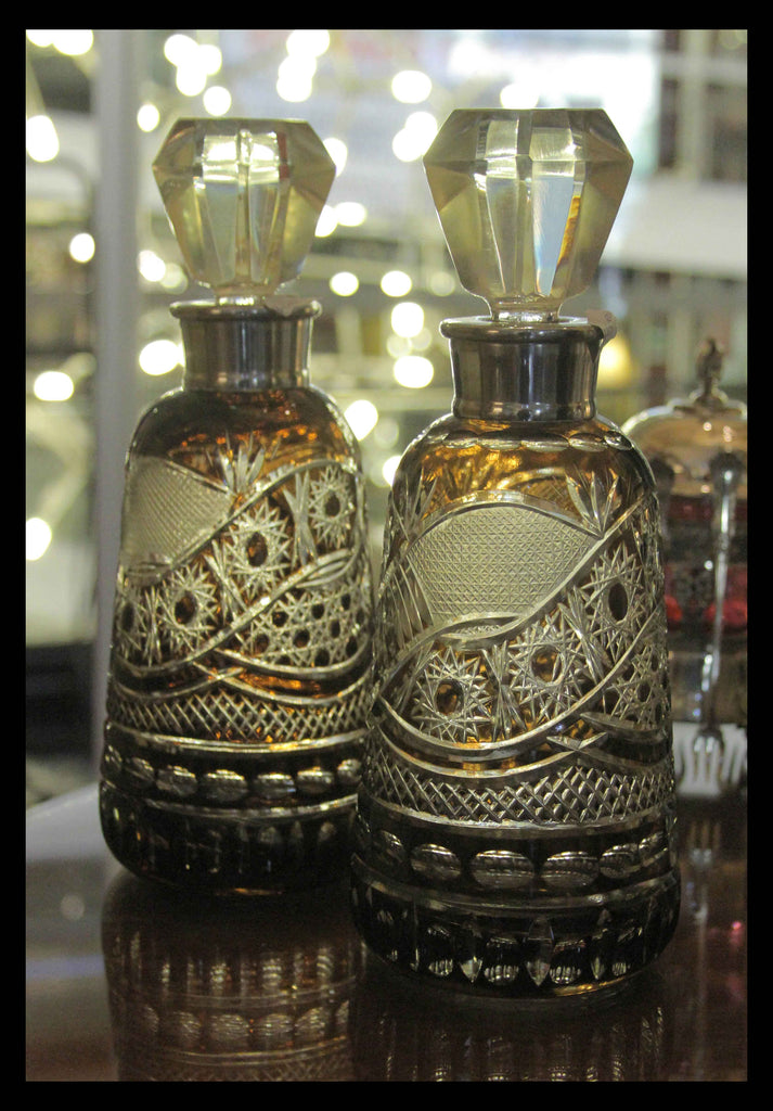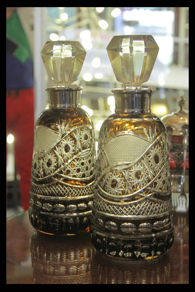 Par de botellas licoreras de cristal de Checoslovaquia, enteras talladas y con un especial color amarillo tipo ocre que varía según la luz. Sus tapas son originales y destaca el detallado tallado y el aspecto curvo del cuerpo de la botella.