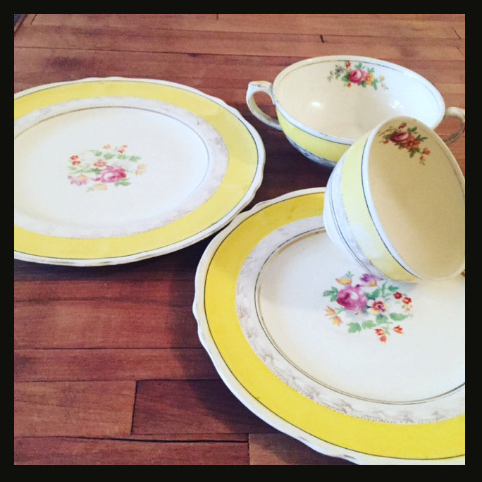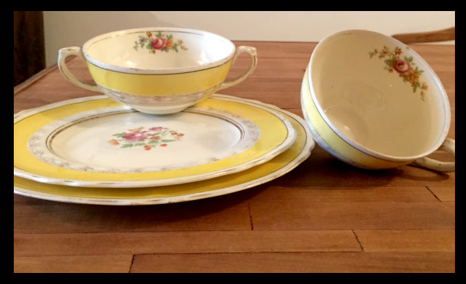 Juego de porcelana de cuatro piezas pintado en tonos amarillo y motivos florales. Consta de un plato grande, un plato mediano, una taza y una consomera.TII.439 JUEGO DE 4 PIEZASEDisponible$$48.000