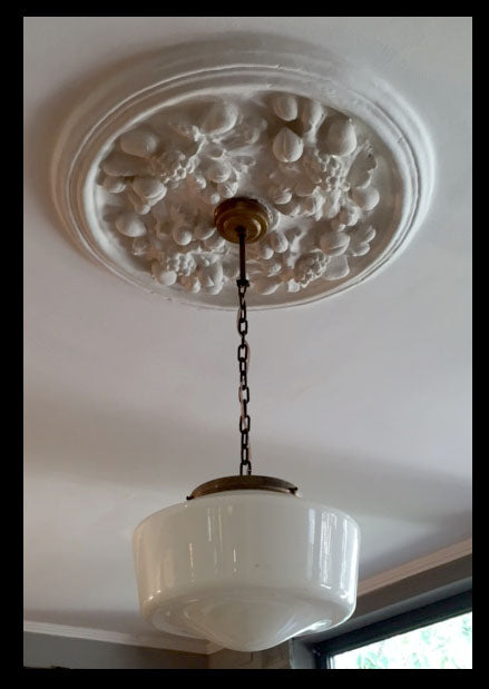 Lámpara colgante art decó con opalina blanca en formas geométricas. Base y cadena de bronce.