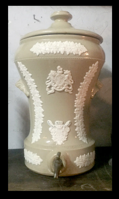 Clásico filtro de agua de loza inglesa en perfecto estado y con todas sus piezas. Hoy estos son elementos decorativos y de colección puesto que no funcionan para filtrar el agua. En cuanto a funcionalidad, han sido reemplazados por elementos de materiales más livianos y económicos.