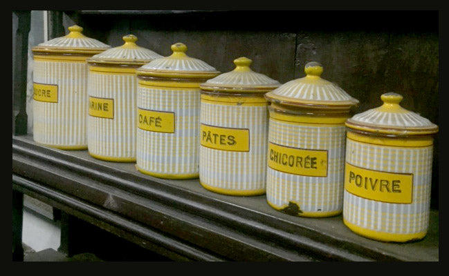 Hoy en día, la mayoría de las cocinas se encuentran integradas a las zonas comunes de las casas. Por estos motivos es que ha renacido la necesidad de decorar las cocinas con objetos originales, especiales y bellos.Esta colección de 6 frascos esmaltados en delicado diseño geométrico son de origen francés y son utilizados para almacenar 6 de los ingredientes más utilizados en la cocina: azúcar, harina, café, pastas, achicoria y pimienta. Hoy sele puede dar un uso decorativo o funcional según se prefiera.