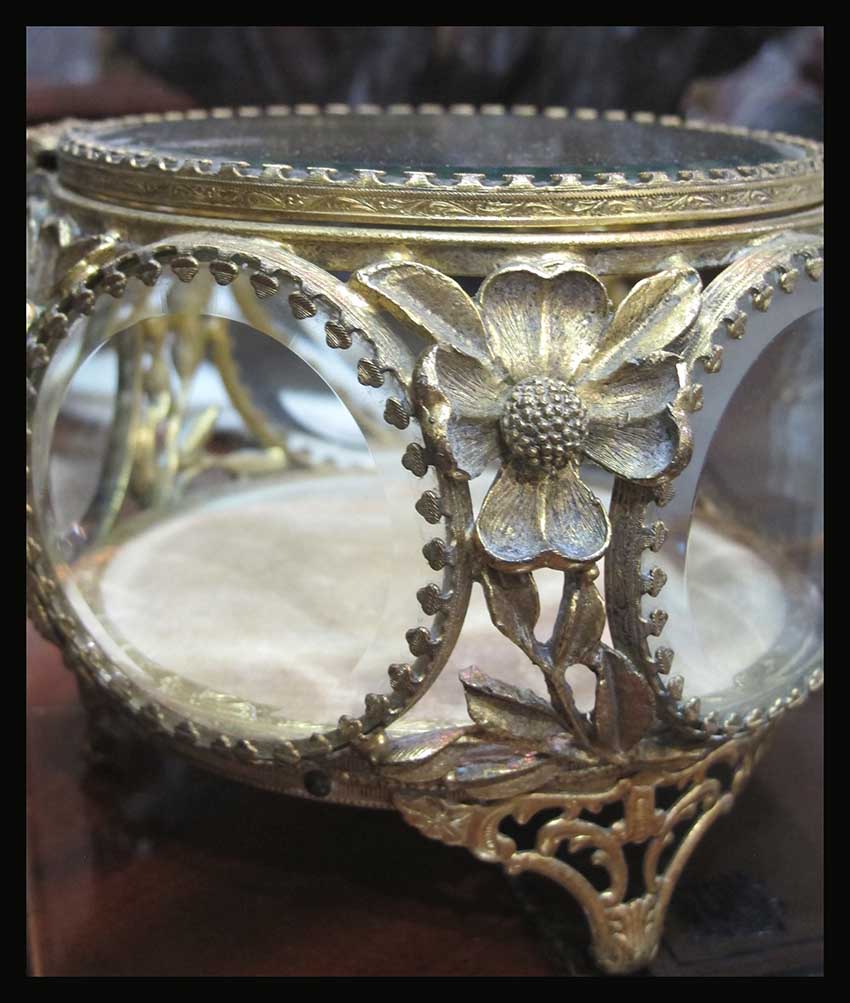 Joyero de cristal biselado y bronce fundido con motivos florales. Posee 5 caras de cristal redondo y patitas de bronce.