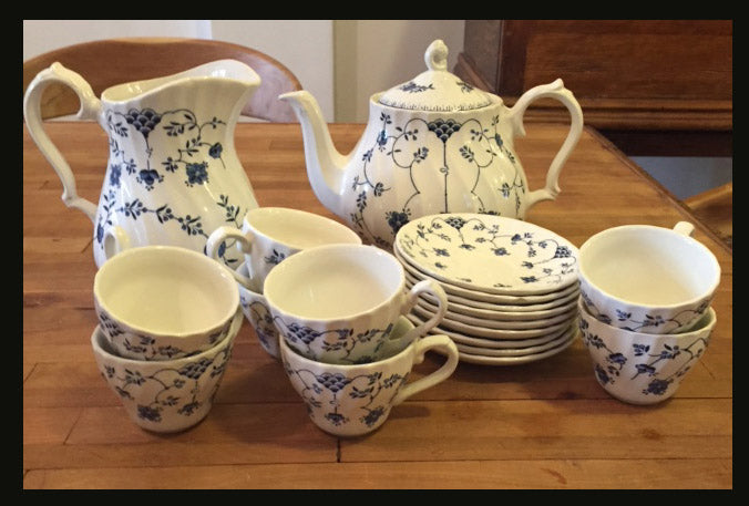 El té si introdujo desde China a Inglaterra a mediados del siglo XVII. Con esto, comenzó a desarrollarse toda una moda en torno a la forma de consumirlo. Era un producto extremadamente caro que se guardaba en cajas con llave. Recién a fines del siglo XVIII se hicieron populares los servicios completos de té. La taza con asa y platillo que hoy conocemos es una invención occidental, puesto que en oriente eras pequeños vasitos sin asas.Este juego de té para 8, es de cerámica y está decorado con el clásico patrón Helsinki, Finlandia en tono azul. Es de la fábrica Churchill de más de 200 años de experiencia desarrollando diversos modelos de vajilla en cerámica, porcelana y otros.