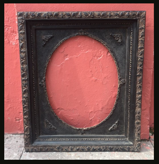 Marco de muro de madera tallada pintado negro gastado con su interior ovalado, ideal para espejos, retratos o decorativo.