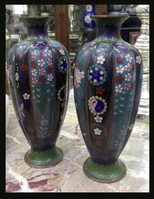 El esmalte alveolado o cloisonné es una antigua técnica para decoración de objetos metálicos, mediante el uso de esmalte vidriado, y en períodos antiguos mediante el uso también de incrustaciones de piedras preciosas, vidrio, y otros materiales. Los objetos tratados con esta técnica a veces son denominados cloisonné. Para realizar la decoración primero se agregan alvéolos o compartimentos al objeto. Estos agregados son visibles en la pieza terminada, sirviendo de separación entre los numerosos compartimentos de esmalte de colores iguales o distintos.Este es un par de floreros de cloisonné con motivos geométricos y florales muy antiguos. Eso se nota por los tonos más opacos de sus esmaltes.