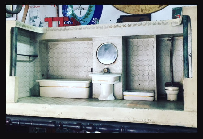 Maqueta arquitectónica de baño con materialidades originales como bronce y loza hecha a escala.