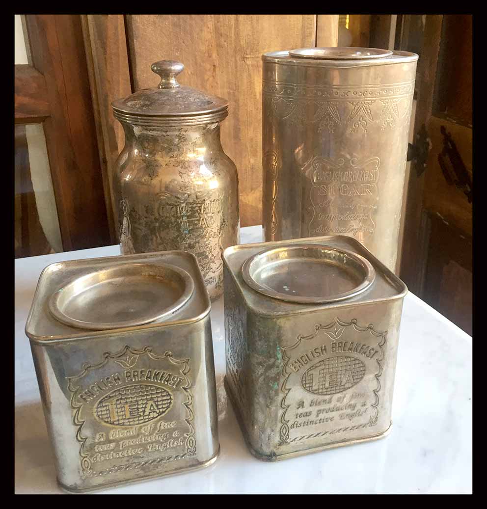 4 piezas de colección de metal gastado y decorado en donde se almacenaba té y azúcar.