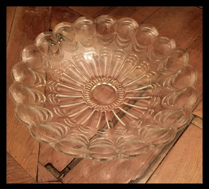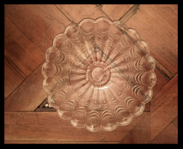 Gran platillo tipo centro de mesa redondo de baja altura con decorados curvos y geométricos. Puede servir como frutero, fuente o simplemente decorativo. Por el tipo de trabajo y su peso, nos damos cuenta de que su materialidad es vidrio.