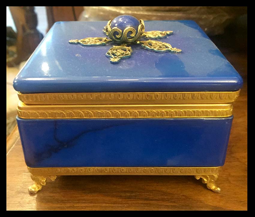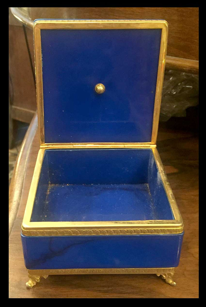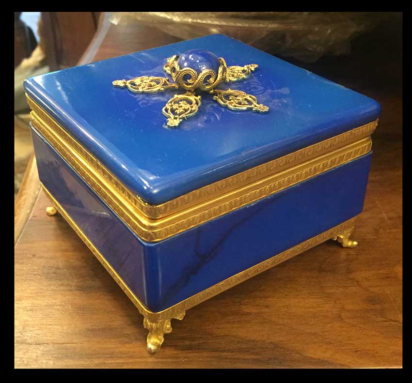 Joyero de opalina azul y bronce ornolú.La opalina o vidrio lechoso fue fabricado por primera vez en Murano a comienzos de 1400, pero se popularizó recién en la Venecia del siglo XVI. Su color por excelencia es el blanco lo que, en conjunto con su aspecto semitraslúcido, le ha dado el nombre de Milk Glass en inglés. Se utiliza con frecuencia en iluminación por la traslucidez y calidez del material.Los joyeros son el lugar natural para guardar todas las joyas, estando pensados para mantenerlas organizadas y seguras, pero también para decorar.