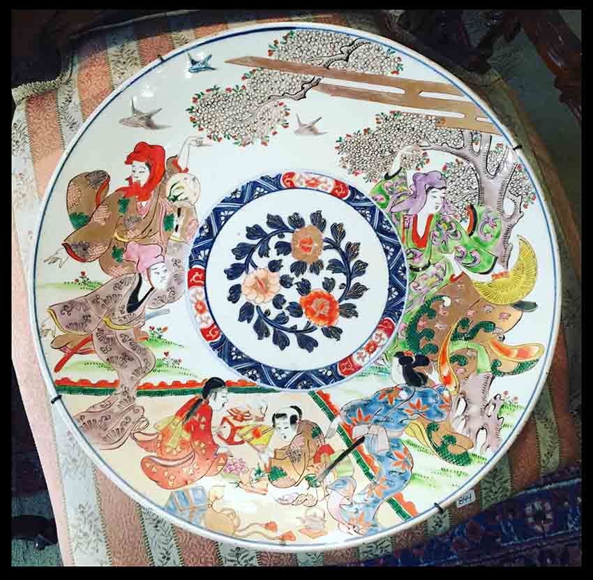 Gran centro de mesa Imarí con motivos japoneses.La porcelana de Imari, es el nombre occidental que se le ha dado a los productos hechos en Arita, Japón. El nombre se debe a que estos se exportaban desde Imarí. Esta porcelana, fue la primera desarrollada en Japón y se popularizó en Occidente a mediados del siglo XVII y sus diseños fueron muy influyentes en la orientalización de la porcelana europea.