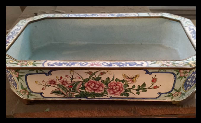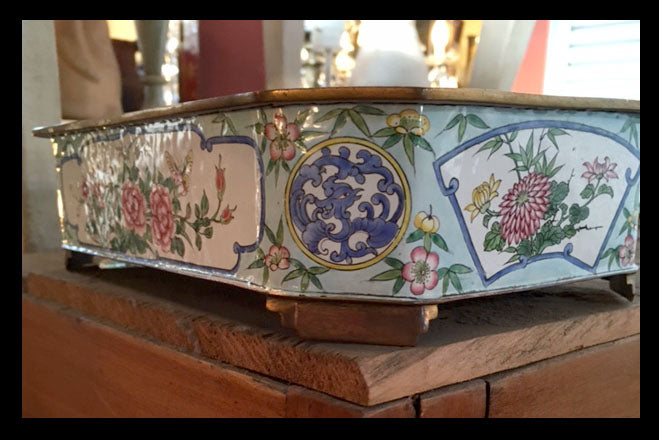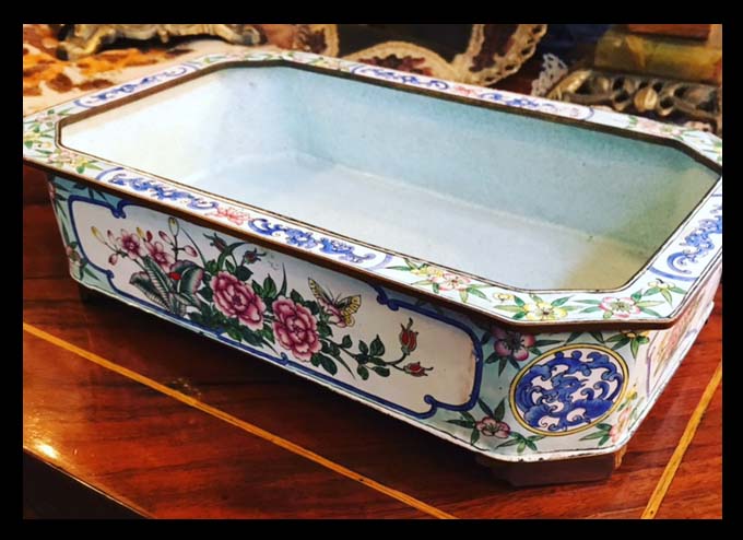 En la Europa del siglo XIX se desarrolló el mayor refinamiento en la manera de servir alimentos y bebidas. De esa época datan miles de diseños de bandejas y otros utensilios cada vez más dedicados y originales.Esta es una fuente rectangular esmaltada con diseños florales de 30×20 cm, que puede servir como fuente o simplemente decorativo.